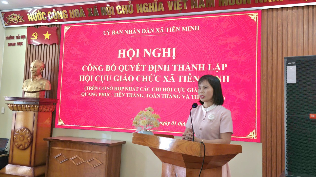 Phát biểu chúc mừng tại hội nghị, đồng chí Phạm Thị Xuân – Uỷ viên BTV Đảng ủy, Phó Chủ tịch Thường trực UBND xã nhấn mạnh việc hợp nhất và thành lập Hội Cựu giáo chức xã Tiên Minh là dấu mốc quan trọng, thể hiện sự quan tâm của cấp ủy, chính quyền địa phương đối với đội ngũ nhà giáo đã nghỉ hưu. Đồng chí mong muốn Ban Chấp hành lâm thời đoàn kết, phát huy trí tuệ tập thể, tiếp tục xây dựng phong trào hội ngày càng vững mạnh, trở thành điểm tựa tinh thần cho hội viên. Đồng thời mong muốn hội viên tiếp tục phát huy tinh thần trách nhiệm, gương mẫu, góp phần xây dựng xã Tiên Minh ngày càng giàu đẹp, văn minh./.